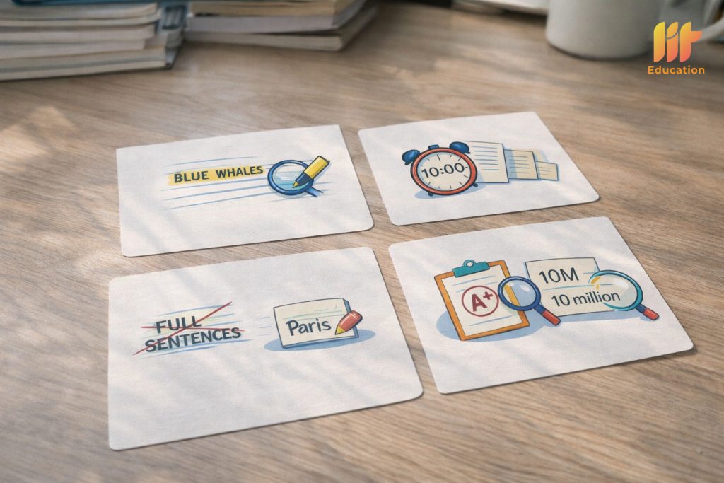 - Luyện kiểm soát số từ bằng “thói quen đếm nhanh”: sau khi chép đáp án, dừng 2 giây để đếm từ và loại bỏ từ thừa như mạo từ/giới từ khi không cần thiết. Đây là cách giảm nhanh lỗi mất điểm oan.